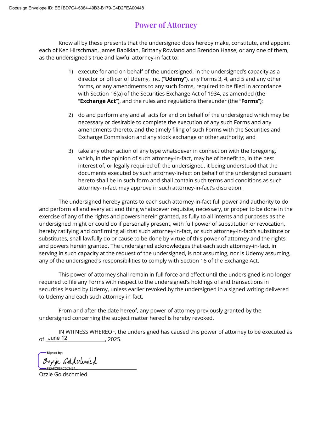 Power of Attorney Know all by these presents that the undersigned does hereby make, constitute, and appoint each of Ken Hirschman, James Babikian, Brittany Rowland and Brendon Haase, or any one of them, as the undersigned’s true and lawful attorney-in fact to: 1) execute for and on behalf of the undersigned, in the undersigned’s capacity as a director or officer of Udemy, Inc. (“Udemy”), any Forms 3, 4, and 5 and any other forms, or any amendments to any such forms, required to be filed in accordance with Section 16(a) of the Securities Exchange Act of 1934, as amended (the “Exchange Act”), and the rules and regulations thereunder (the “Forms”); 2) do and perform any and all acts for and on behalf of the undersigned which may be necessary or desirable to complete the execution of any such Forms and any amendments thereto, and the timely filing of such Forms with the Securities and Exchange Commission and any stock exchange or other authority; and 3) take any other action of any type whatsoever in connection with the foregoing, which, in the opinion of such attorney-in-fact, may be of benefit to, in the best interest of, or legally required of, the undersigned, it being understood that the documents executed by such attorney-in-fact on behalf of the undersigned pursuant hereto shall be in such form and shall contain such terms and conditions as such attorney-in-fact may approve in such attorney-in-fact’s discretion. The undersigned hereby grants to each such attorney-in-fact full power and authority to do and perform all and every act and thing whatsoever requisite, necessary, or proper to be done in the exercise of any of the rights and powers herein granted, as fully to all intents and purposes as the undersigned might or could do if personally present, with full power of substitution or revocation, hereby ratifying and confirming all that such attorney-in-fact, or such attorney-in-fact’s substitute or substitutes, shall lawfully do or cause to be done by virtue of this power of attorney and the rights and powers herein granted. The undersigned acknowledges that each such attorney-in-fact, in serving in such capacity at the request of the undersigned, is not assuming, nor is Udemy assuming, any of the undersigned’s responsibilities to comply with Section 16 of the Exchange Act. This power of attorney shall remain in full force and effect until the undersigned is no longer required to file any Forms with respect to the undersigned’s holdings of and transactions in securities issued by Udemy, unless earlier revoked by the undersigned in a signed writing delivered to Udemy and each such attorney-in-fact. From and after the date hereof, any power of attorney previously granted by the undersigned concerning the subject matter hereof is hereby revoked. IN WITNESS WHEREOF, the undersigned has caused this power of attorney to be executed as of _________________________, 2025. Ozzie Goldschmied Docusign Envelope ID: EE1BD7C4-5384-49B3-B179-C4D2FEA00448 June 12